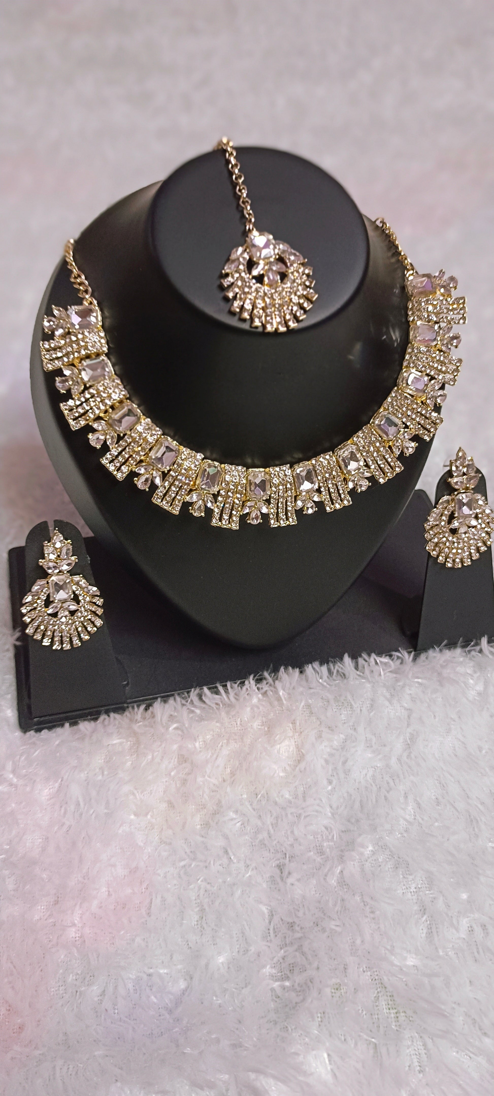 The AD Kundan necklace set is a stunning piece of jewelry that exemplifies the exquisite craftsmanship and timeless elegance of traditional Indian design. Adorned with American Diamonds (AD) and featuring intricate Kundan work, this necklace set is a perfect blend of contemporary style and classical charm. The meticulous placement of stones and the intricate patterns create a dazzling effect that makes the wearer stand out at any event. Often paired with matching earrings and sometimes a maang tikka, the AD Kundan necklace set is ideal for weddings, festive occasions, or any special celebration, adding a touch of regal sophistication to any outfit.